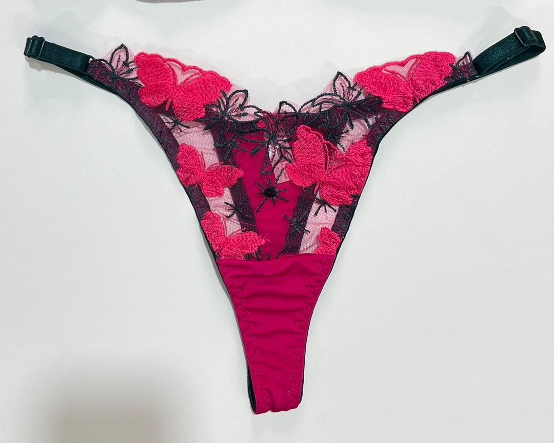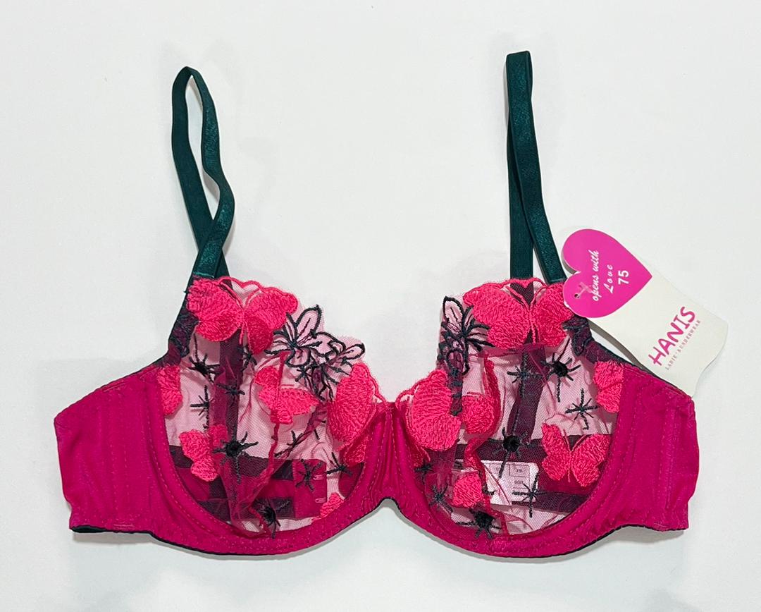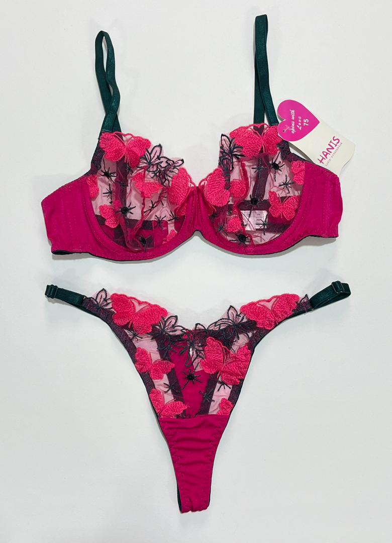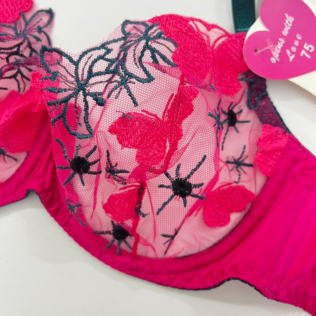 کاپهای این سوتین از لایهای تور محکم و بدننما تشکیل شدهاند که روی آن پروانههای سرخابی رنگ با ظرافت تمام گلدوزی شدهاند.