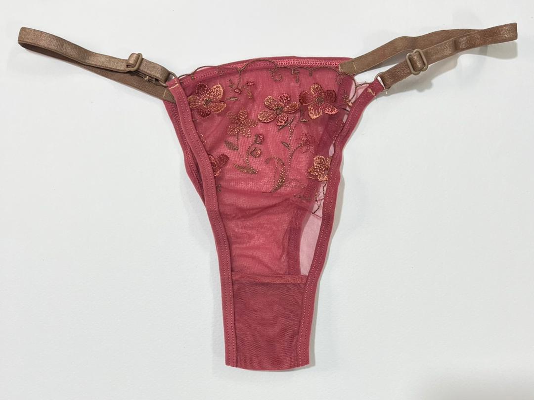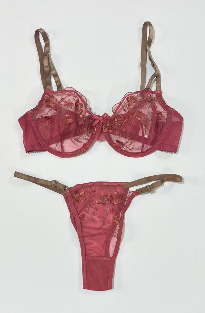 نقطه قوت این ست، استفاده از پارچه تور بدننما (Sheer) با کیفیت بسیار بالاست. روی این تور لطیف، گلدوزیهای برجسته و براق به شکل گل نقش بستهاند که روی پوست بدن جلوهای بینهایت رمانتیک و لوکس ایجاد میکنند. ترکیب رنگ سرخابی پارچه اصلی با بندهای براق به رنگ برنزی/نسکافهای، هارمونی رنگی بینظیری خلق کرده است.