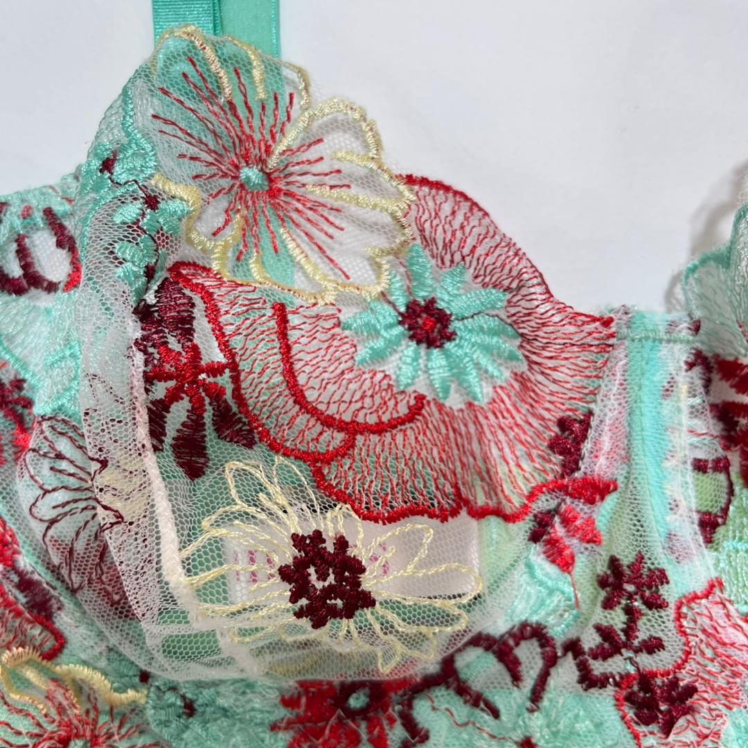 روی تورِ بدننمای این ست، گلهایی با طیف رنگی گرم (قرمز، زرشکی و لیمویی) گلدوزی شدهاند. این تضاد رنگی بین زمینه سرد (سبز) و گلهای گرم، باعث میشود طرحها کاملاً برجسته و سهبعدی به نظر برسند.
