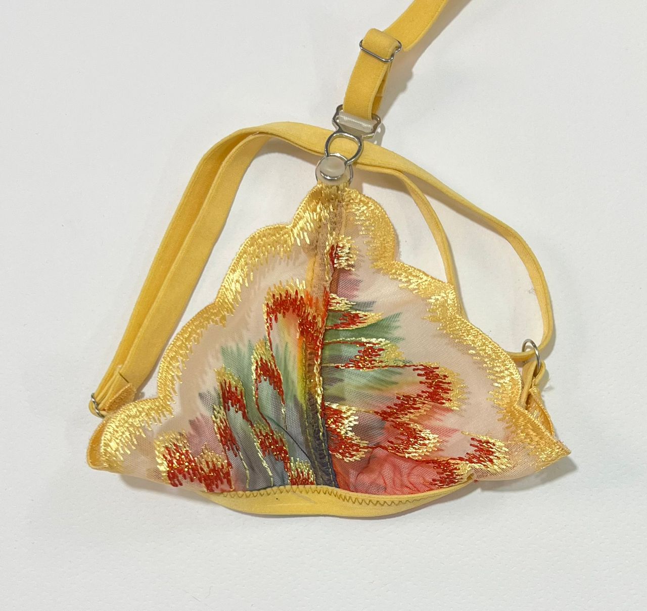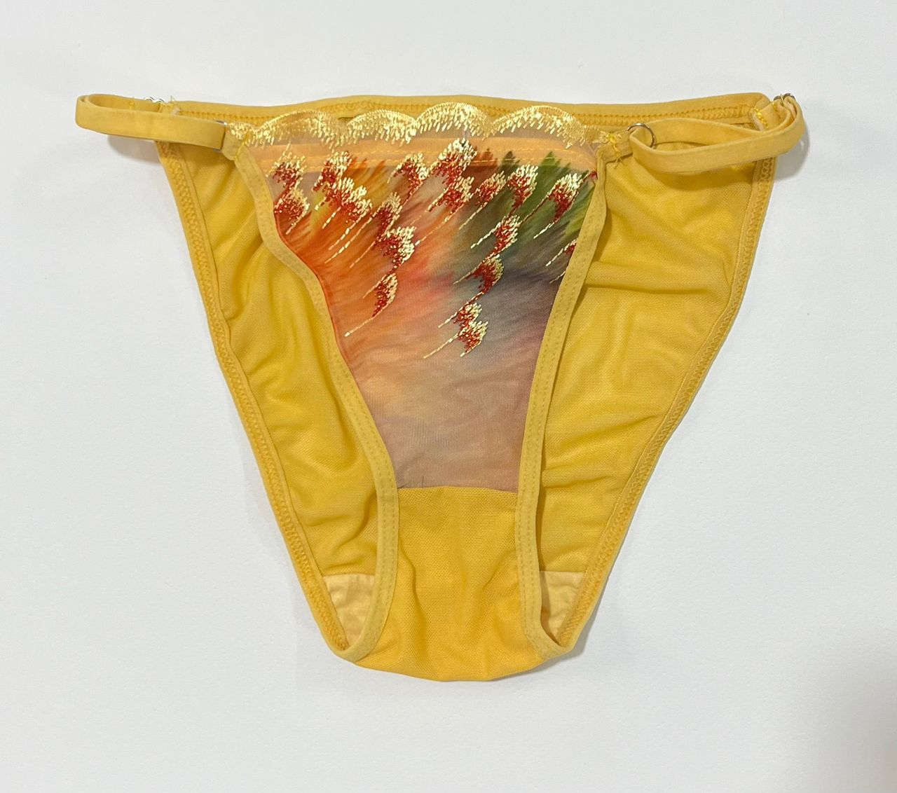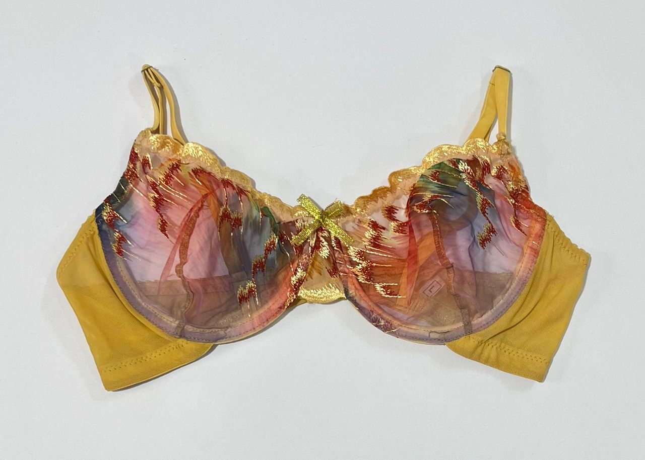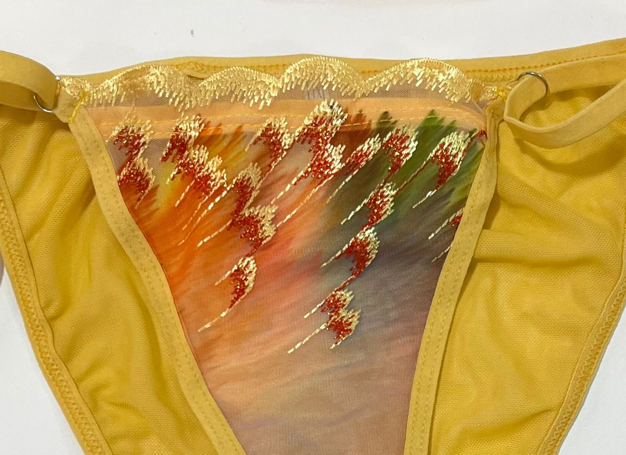 - سوتین (سایز L – لارج): مدل فنردار و بدون اسفنج (Full Sheer) که فرم طبیعی سینه را حفظ کرده و با گلدوزیهای طرح پر پوشیده شده است.